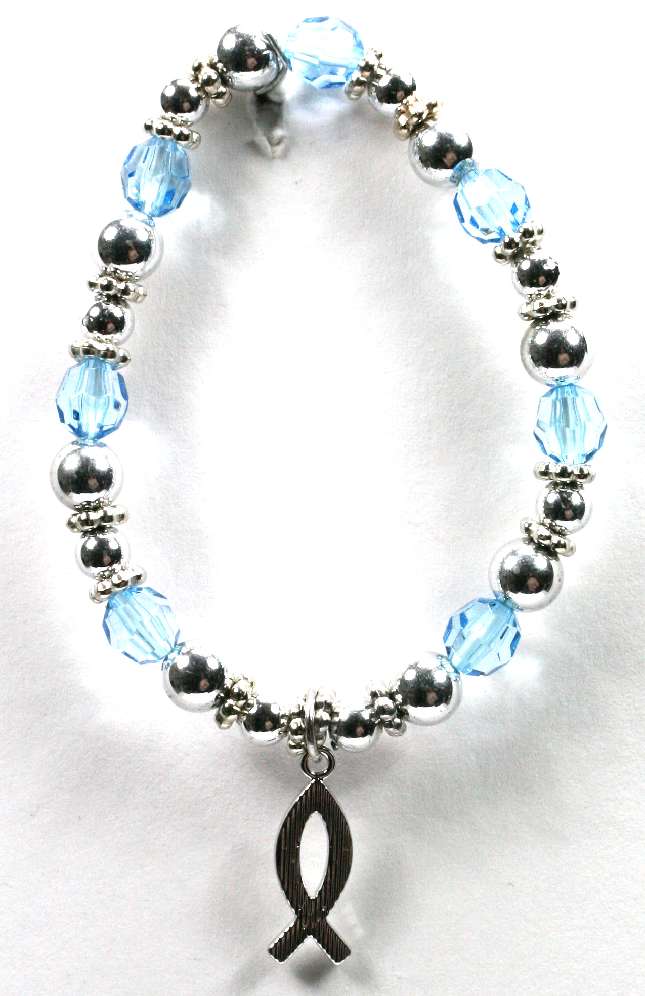 → Kunststoff - Verarbeitung: Perlen im Wechsel auf einem eleastischen Gummiband gereiht mit einem Fischanhänger