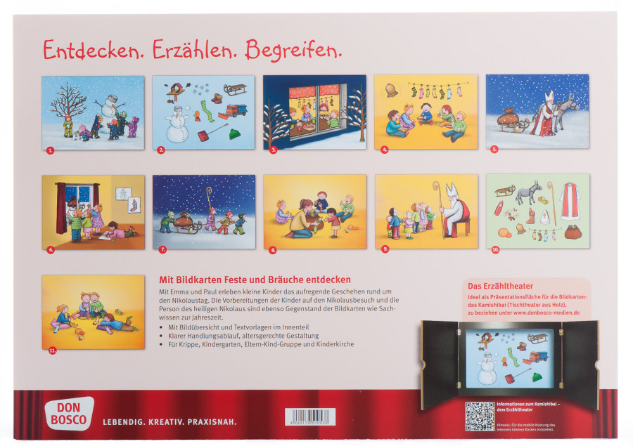 - Mit Emma und Paul erleben kleine Kinder das aufregende Geschehen rund um den Nikolaustag. Die Vorbereitungen der Kinder auf den Nikolausbesuch und die Person des heiligen Nikolaus sind ebenso Gegenstand der Bildkarten wie Sachwissen zur Jahreszeit.