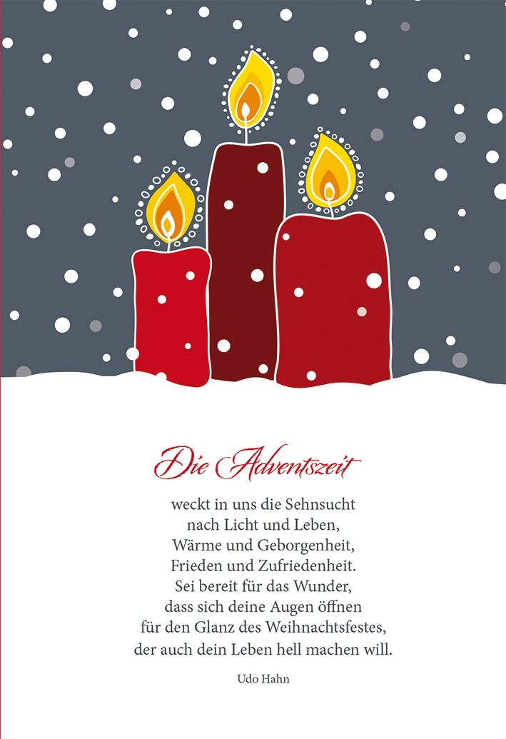 - Die Adventszeit - Die Adventszeit weckt in uns die Sehnsucht nach Licht und Leben, Wärme und Geborgenheit, Frieden und Zufriedenheit. Sei bereit für das Wunder, dass sich deine Augen öffnen für den Glanz des Weihnachtsfestes, der auch dein Leben hell machen will.