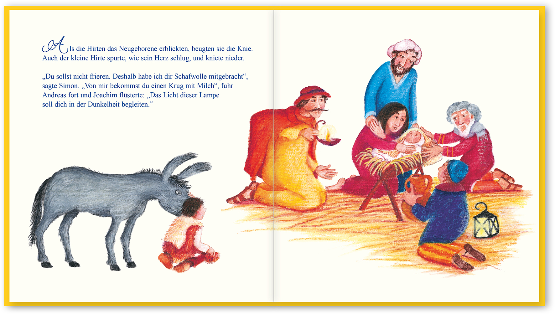 - Der kleine Hirte schläft tief und fest. Er bemerkt nicht, dass die Engel auf dem Feld die frohe Botschaft verkünden, er hört nicht, dass die anderen Hirten aufbrechen, um das Kind im Stall zu suchen. Als er aufwacht, ist er allein. Mit seinem Esel macht er sich auf die Suche nach den anderen Hirten. Schließlich findet auch er das kleine Jesuskind. Doch er hat kein Geschenk wie die anderen Hirten. Traut er sich, das zu verschenken, was ihm am meisten bedeutet?