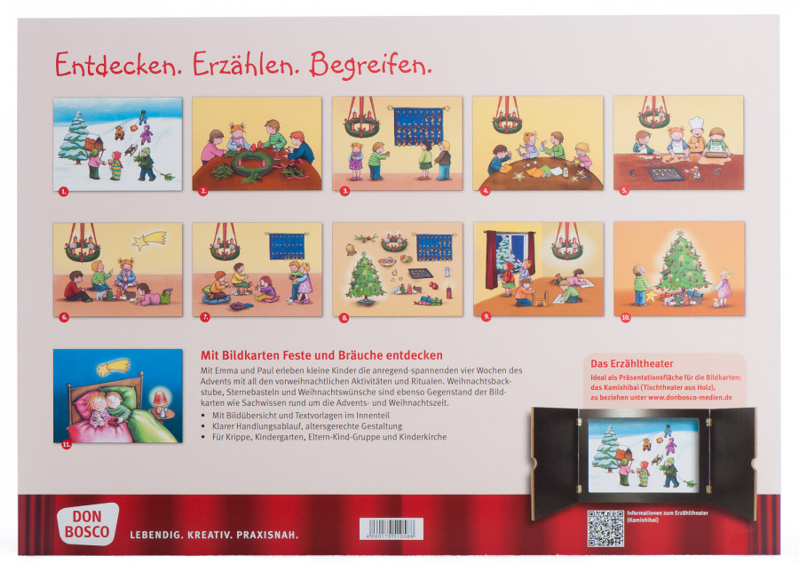 - Mit Emma und Paul erleben kleine Kinder die anregend-spannenden vier Wochen des Advents mit all den vorweihnachtlichen Aktivitäten und Ritualen. Weihnachtsbackstube, Sternebasteln und Weihnachtswünsche sind ebenso Gegenstand der Bildkarten wie Sachwissen rund um die Advents- und Weihnachtszeit..