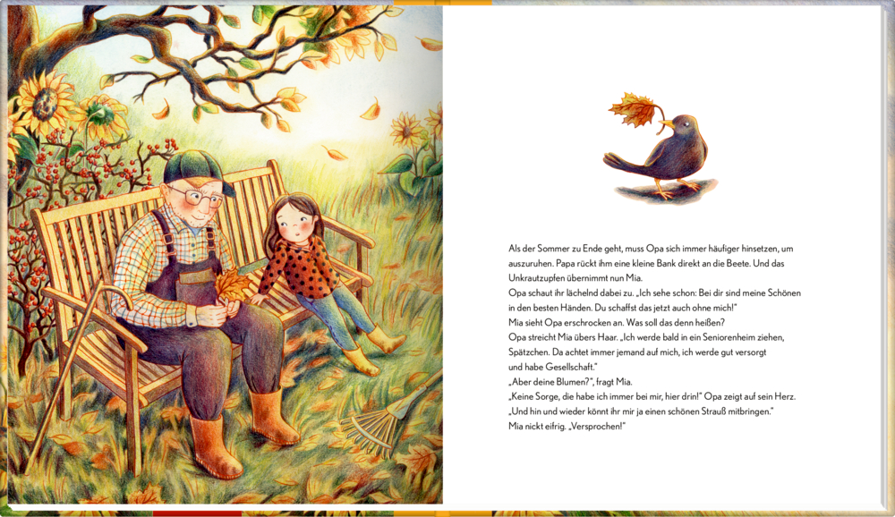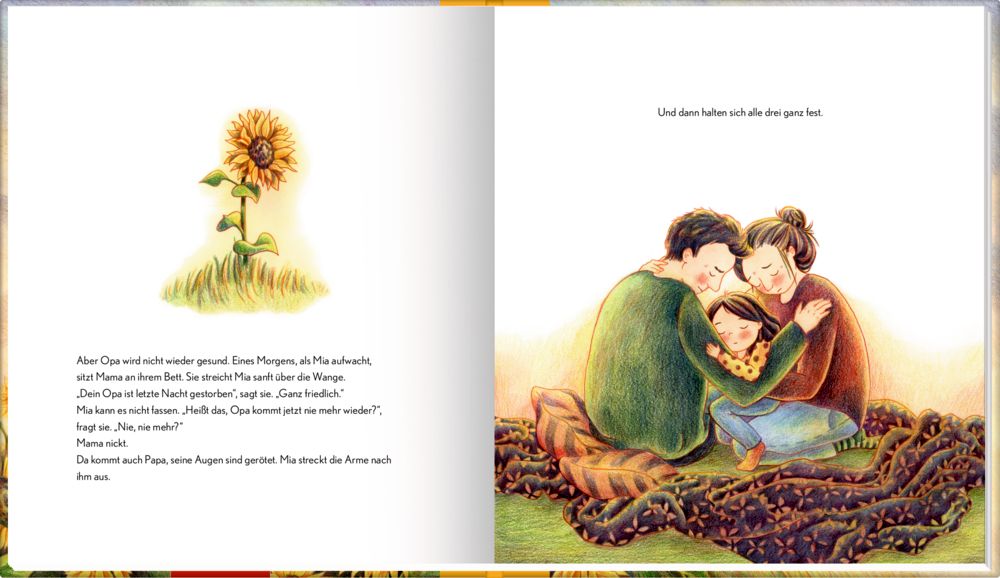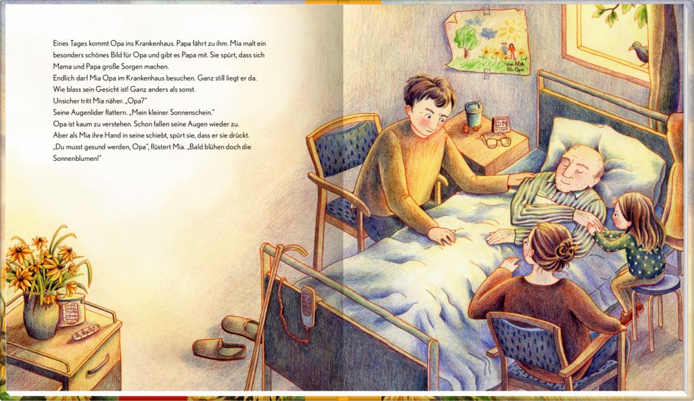 - Mia und ihr Opa lieben es, gemeinsam in seinem kleinen Garten zu buddeln. Opa kennt die Namen aller Blumen, die dort wachsen. Die Sonnenblumen mag er am liebsten. "Wenn sie blühen, scheint in meinem Garten die Sonne", sagt er. Als der Sommer zu Ende geht, zieht Opa in ein Seniorenheim. Mia fällt auf, dass er jetzt viel langsamer geht als früher. Eines Tages kommt er ins Krankenhaus, und er stirbt, kurz bevor die Sonnenblumen wieder blühen. Mia ist unendlich traurig. Doch Traurigsein gehört dazu, wenn man Abschied nehmen muss ... Wie kann man über etwas sprechen, das so unbegreiflich ist wie der Tod? Verstehen Kinder die Wahrheit? Und verkraften sie sie? Sorgen wie diese sind nicht unbegründet, doch Kinder können meist mehr verarbeiten als wir denken