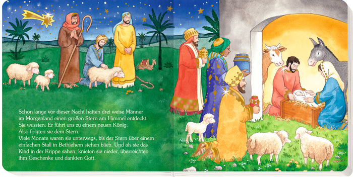 - Alle Jahre wieder feiern wir am 24. Dezember den Heiligen Abend. Dann werden am Weihnachtsbaum die Lichter angezündet, Weihnachtslieder gesungen und Geschenke ausgepackt. Aber wie war das eigentlich mit der Geburt des Jesuskindes? Davon erzählt dieses Pappbilderbuch. Die biblische Weihnachtsgeschichte nach Lukas und Matthäus im handlichen Format und mit Goldfolie auf dem Cover und allen Innenseiten ist das ideale Geschenk für den Adventskalender oder den Nikolausstiefel.