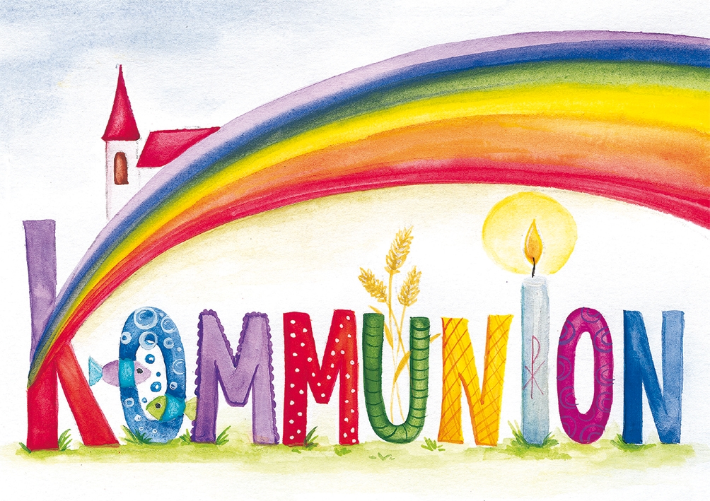 Karte zur Kommunion - Großer Regenbogen & Kirche