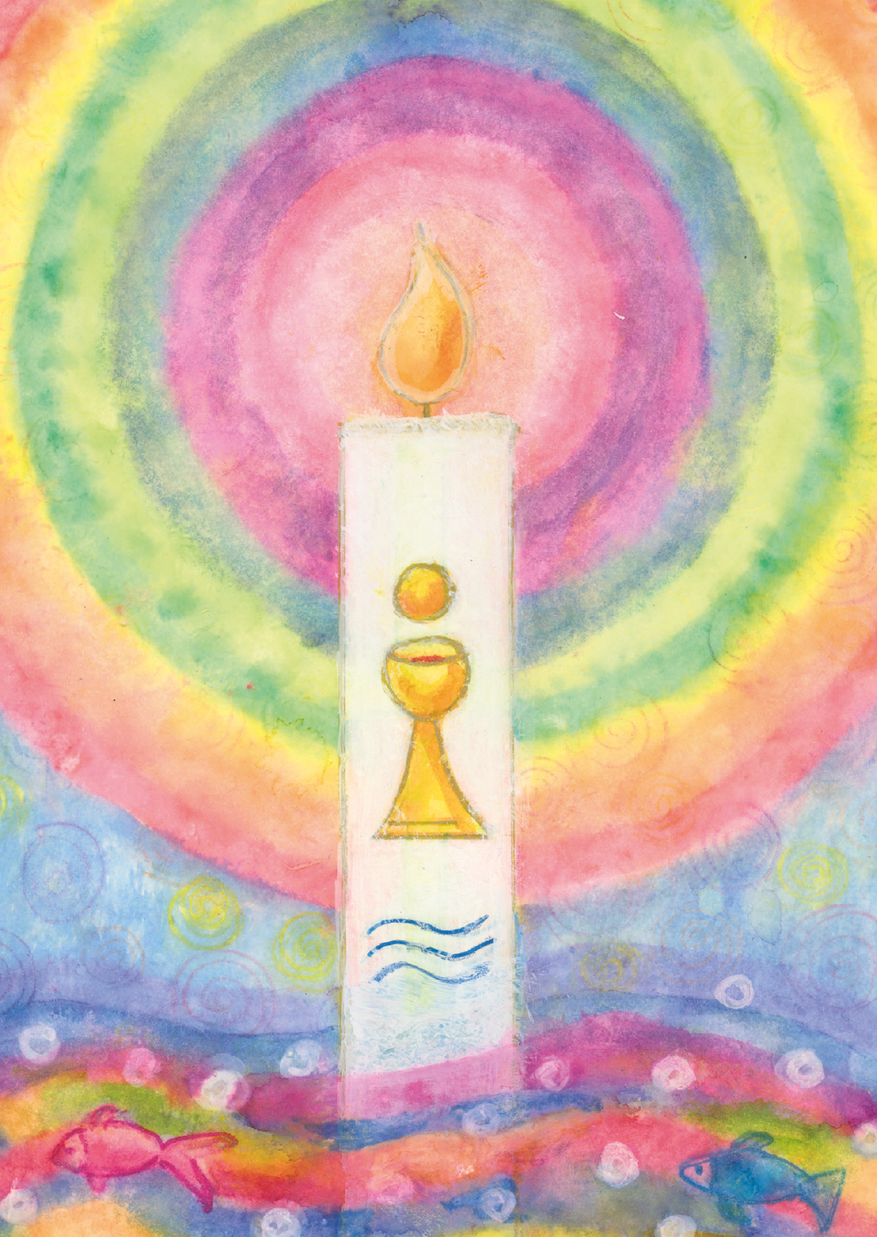 Karte zur Kommunion - Kerzenlicht & Regenbogen