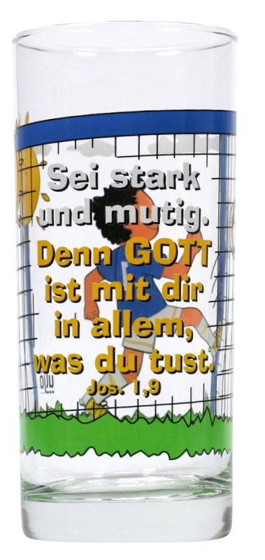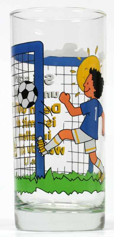 - Glas mit Spruch und abgebildet mit einem Jungen mit Fußball, Sonne und Fußballtor