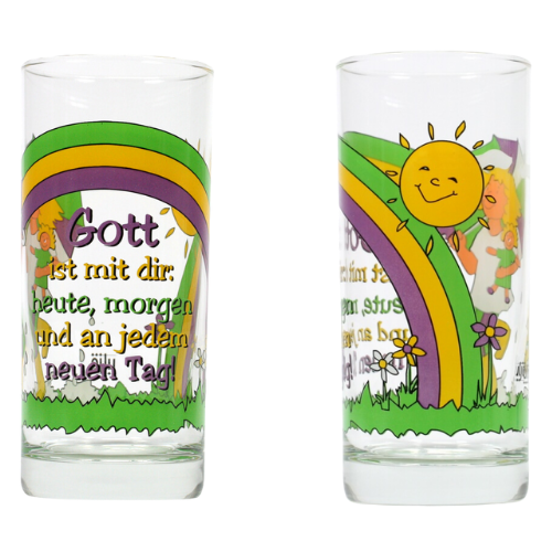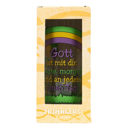 - Text auf dem Glas: "Gott ist mit dir, heute, morgen und an jedem neuen Tag"
