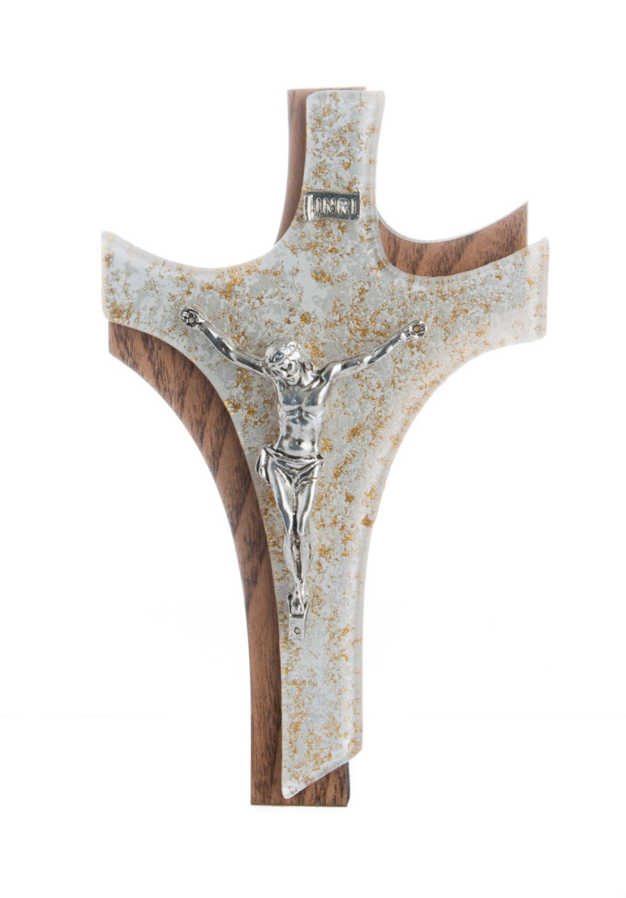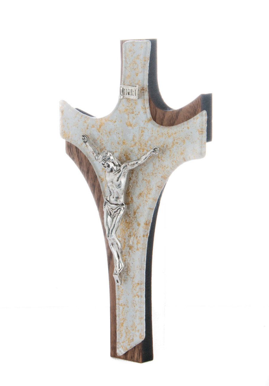 - Holzkreuz mit aufgesetztem Glaselement und Christuskörper