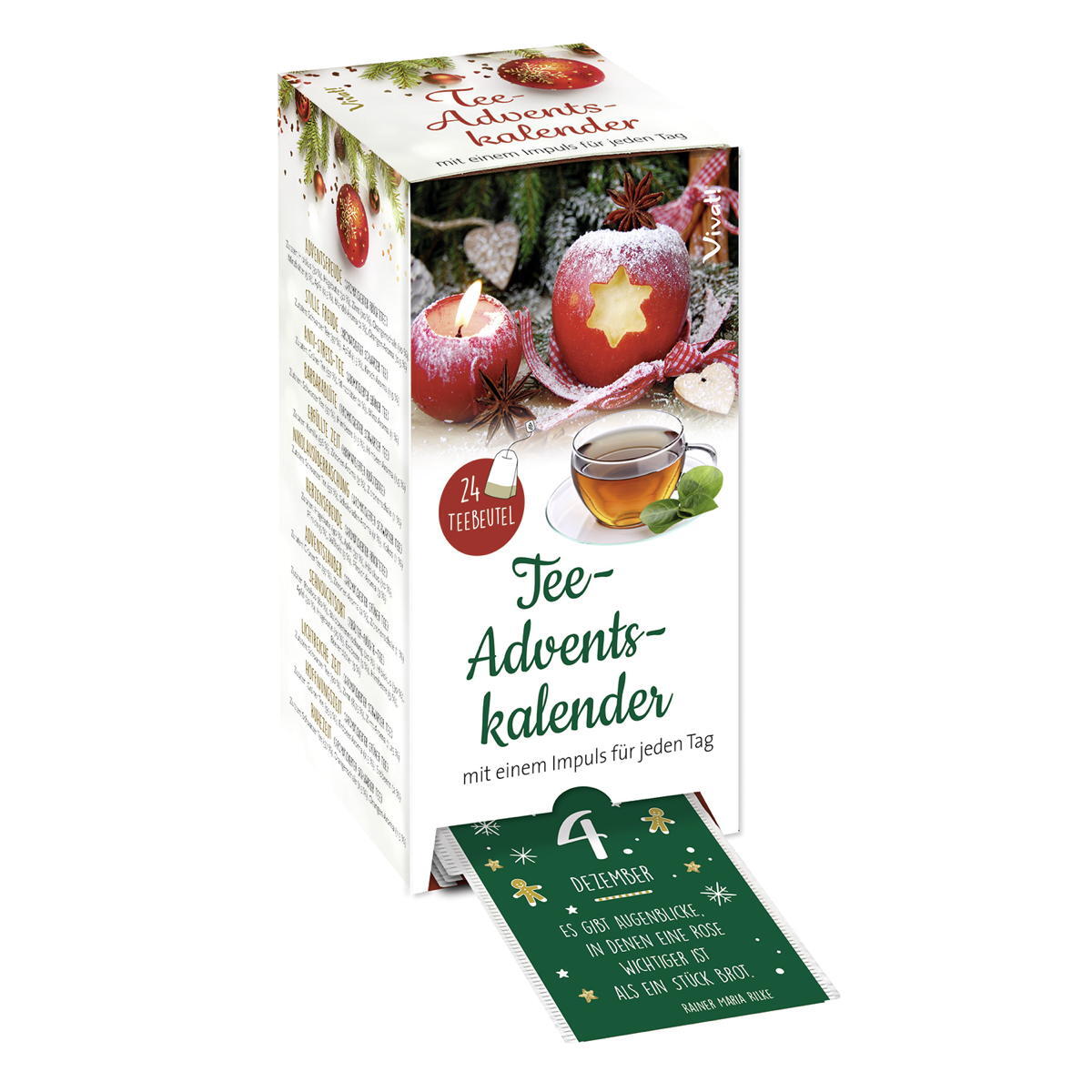 - Dieser geschmackvolle Tee-Adventskalender stimmt ganz besonders auf das kommende Weihnachtsfest ein. Jeden Tag hält er eine andere Teesorte bereit. Von fruchtigen Früchte- und Grünteemischungen über würzige Kräutertees bis zum aromatischen Rooibos- und Schwarztee ist für jeden Geschmack etwas dabei.