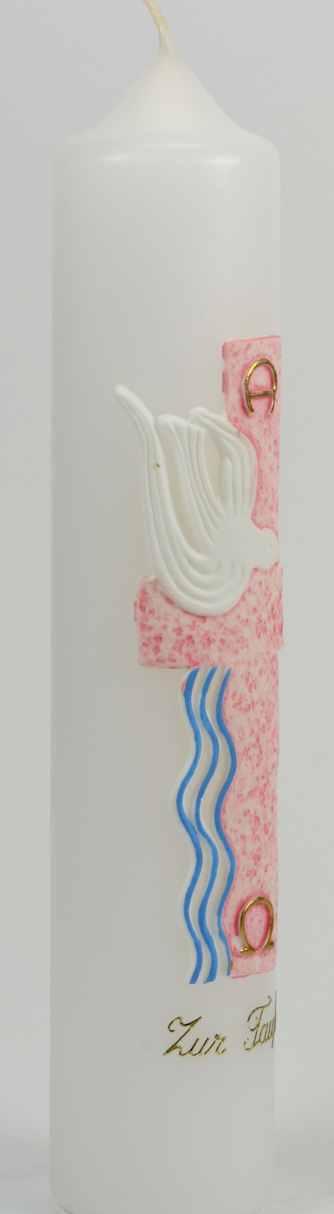 - Wachsmotiv: Kreuz, Taube, Wellen, Alpha und Omega