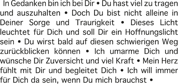 • In Gedanken bin ich bei Dir. Du hast viel zu tragen und auszuhalten. Doch Du bist nicht alleine in Deiner Sorge und Traurigkeit. Dieses Licht leuchtet für Dich und soll Dir ein Hoffnungslicht sein. Du wirst bald auf diesen schwierigen Weg zurückblicken können. Ich umarme Dich und wünsche Dir Zuversicht und viel Kraft. Mein Herz fühlt mit Dir und begleitet Dich. Ich will immer für Dich da sein, wenn Du mich brauchst.