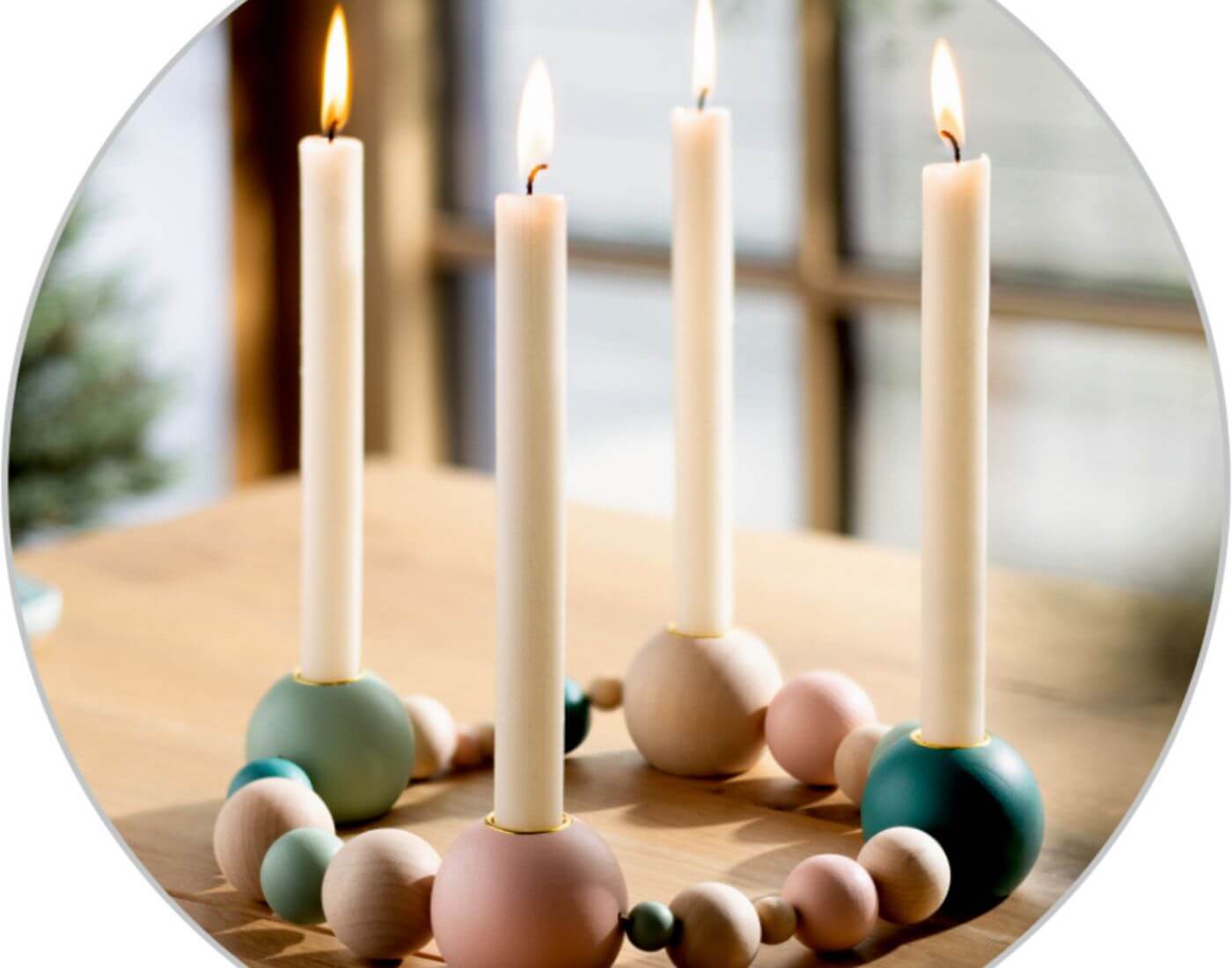 - Dieser stilvolle Kerzenhalter besteht aus Holzkugeln verschiedener Größen im modernen Weihnachtsdesign und eignet sich hervorragend als gemütliche Lichtquelle während der Adventszeit oder als Adventskranz, der das traditionelle Grün durch klare, einfache Formen und Farben ersetzt. Die Deko-Kugeln aus Birkenholz fügen sich stilvoll in jede Weihnachtsdekoration: Ob traditionell oder modern, mit diesem Kerzenleuchter zieht Gemütlichkeit ein.