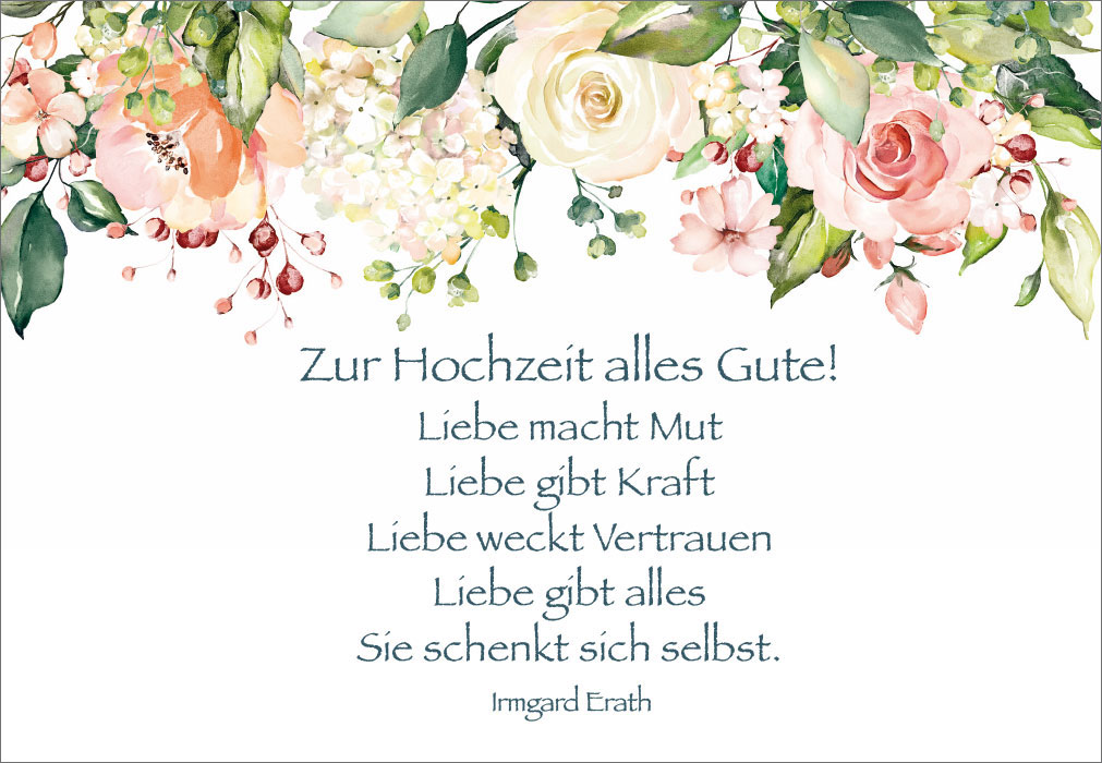 - Zur Hochzeit alles Gute! Liebe macht Mut. Liebe gibt Kraft. Liebe weckt Vertrauen. Liebe gibt alles. Sie schenkt sich selbst.