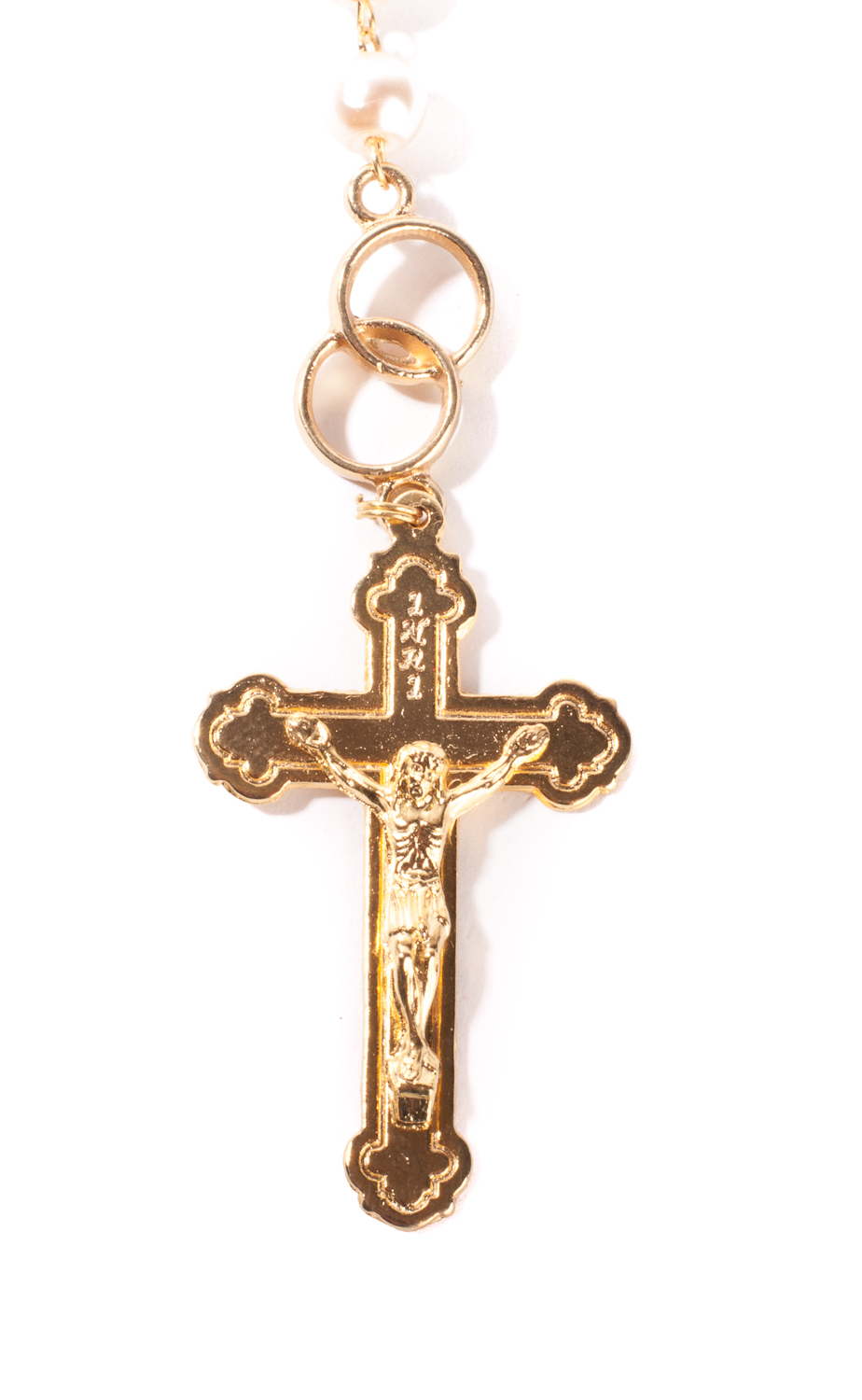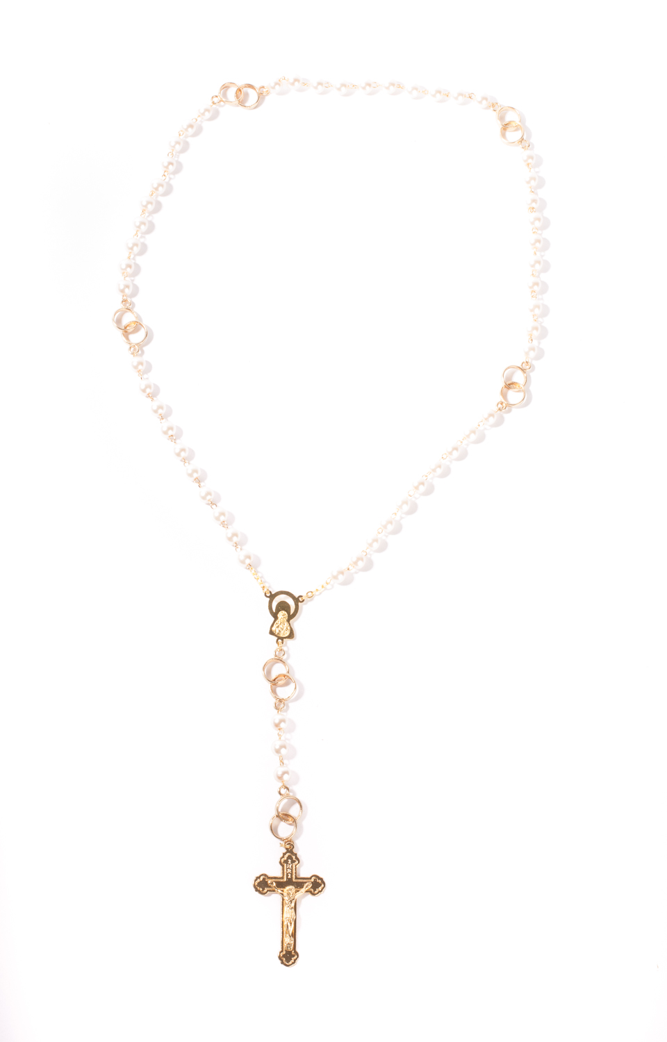 - Goldfarbener Rosenkranz mit Hochzeitsringen