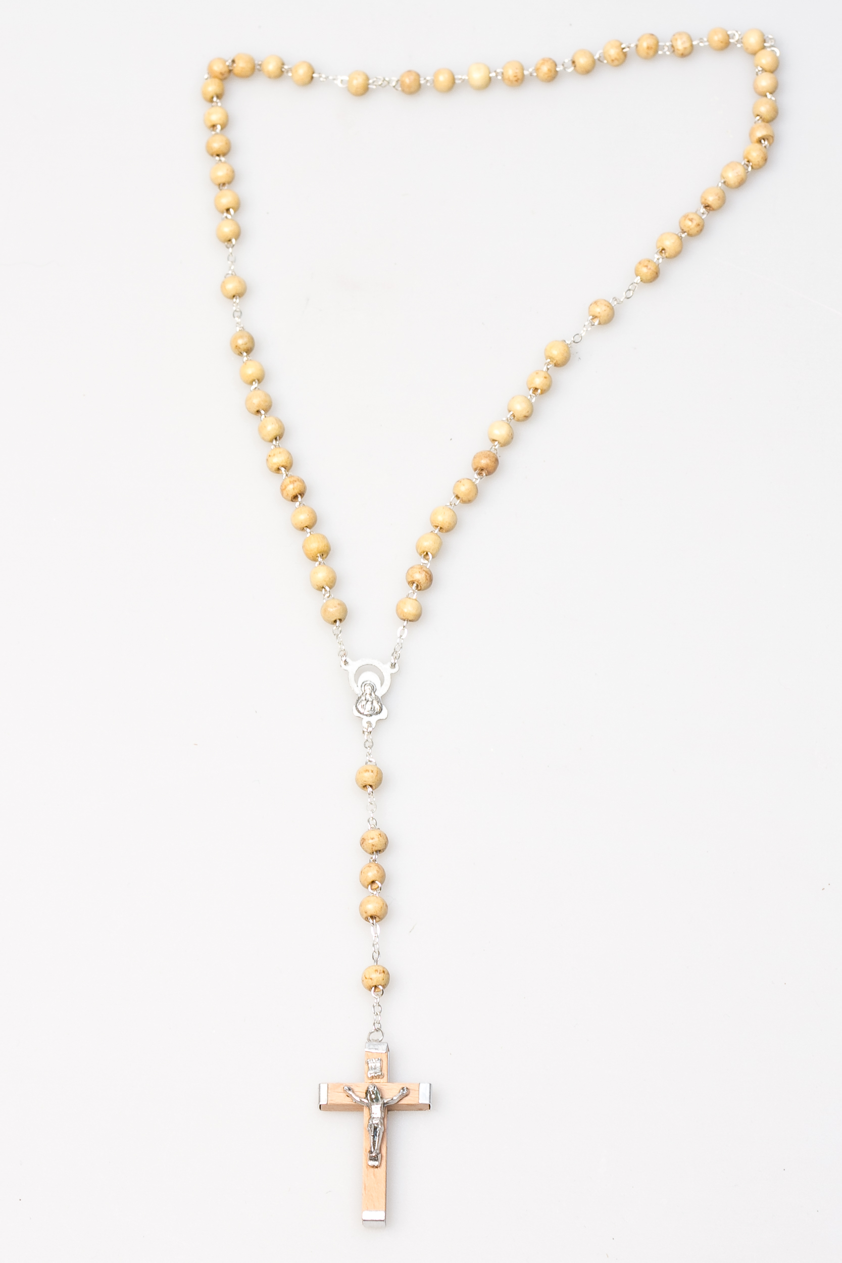 Rosenkranz - Cremefarbene Holzperle & Metallkreuz