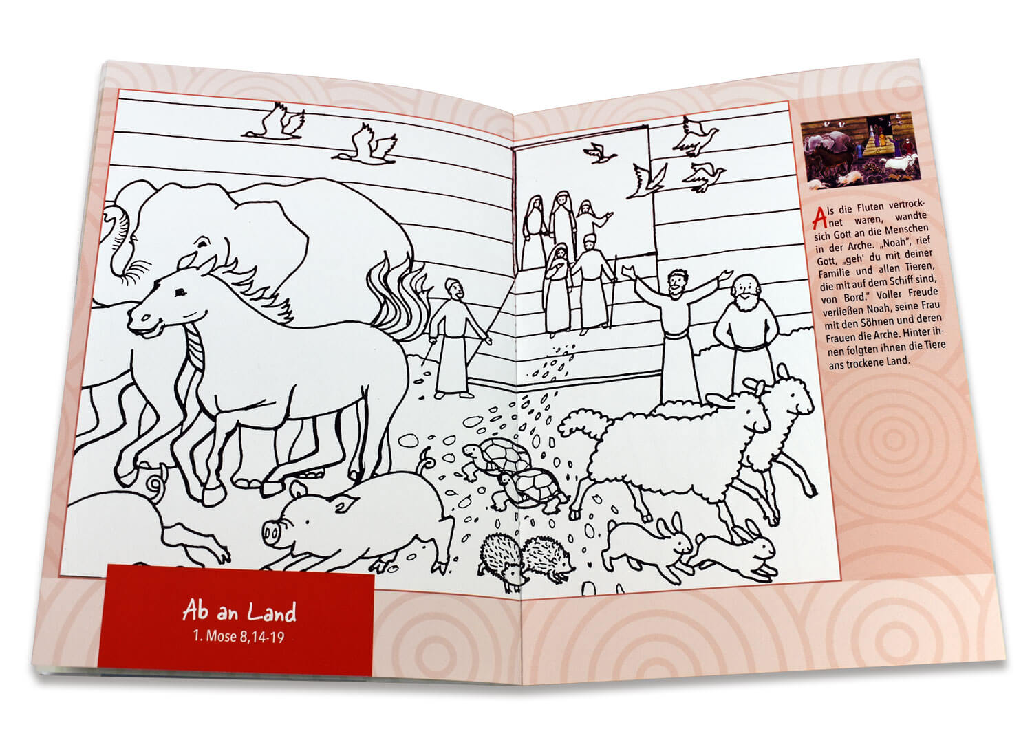 - Mit den liebevoll gestalteten Zeichnungen in dem Malheft lernen schon die Jüngsten spielerisch die Bibelgeschichte rund um Noah, die Tiere und die Arche kennen.