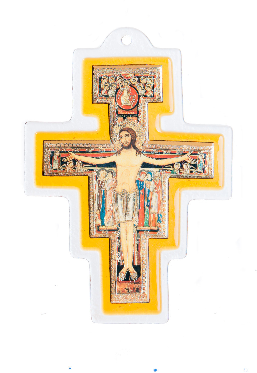 - Die Kreuzikone war ursprünglich in der Kapelle von San Damiano aufgestellt.<br>Der junge Franz von Assisi hörte im Gebet vor diesem Kreuz eine Stimme die ihm sagte: "Franziskus, geh und stell mein Haus wieder her, das, wie du siehst, ganz verfallen ist!" Die Ikone wurde im 12. Jahrhundert von einem syrischen Mönch gemalt. Sie ist voller Symbolkraft. (Beschreibung auf der Rückseite des Kreuzes)
