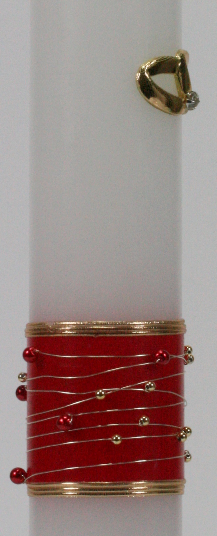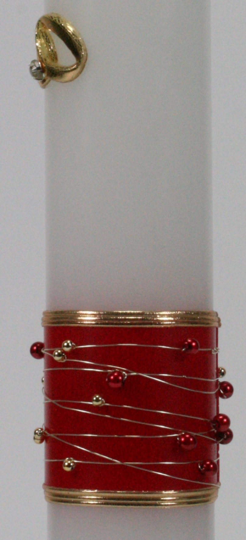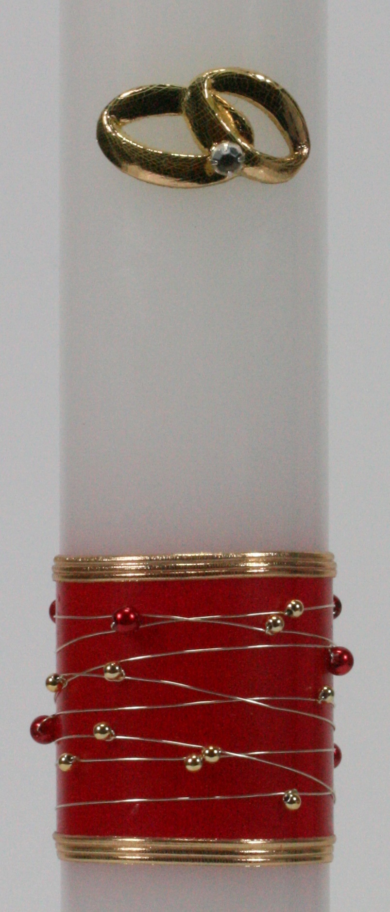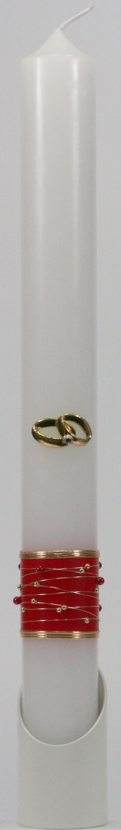Hochzeitskerze - Goldene Ringe & Rotes Perlenband
