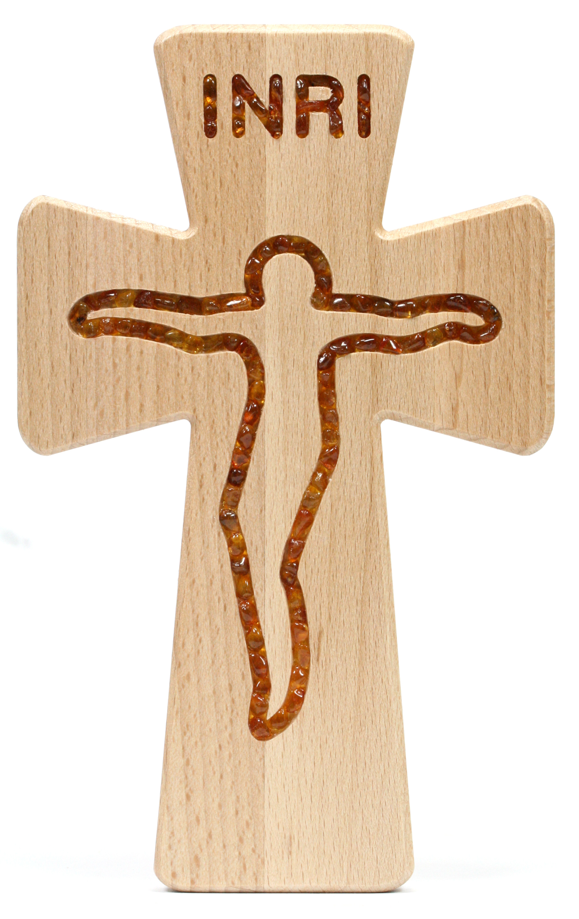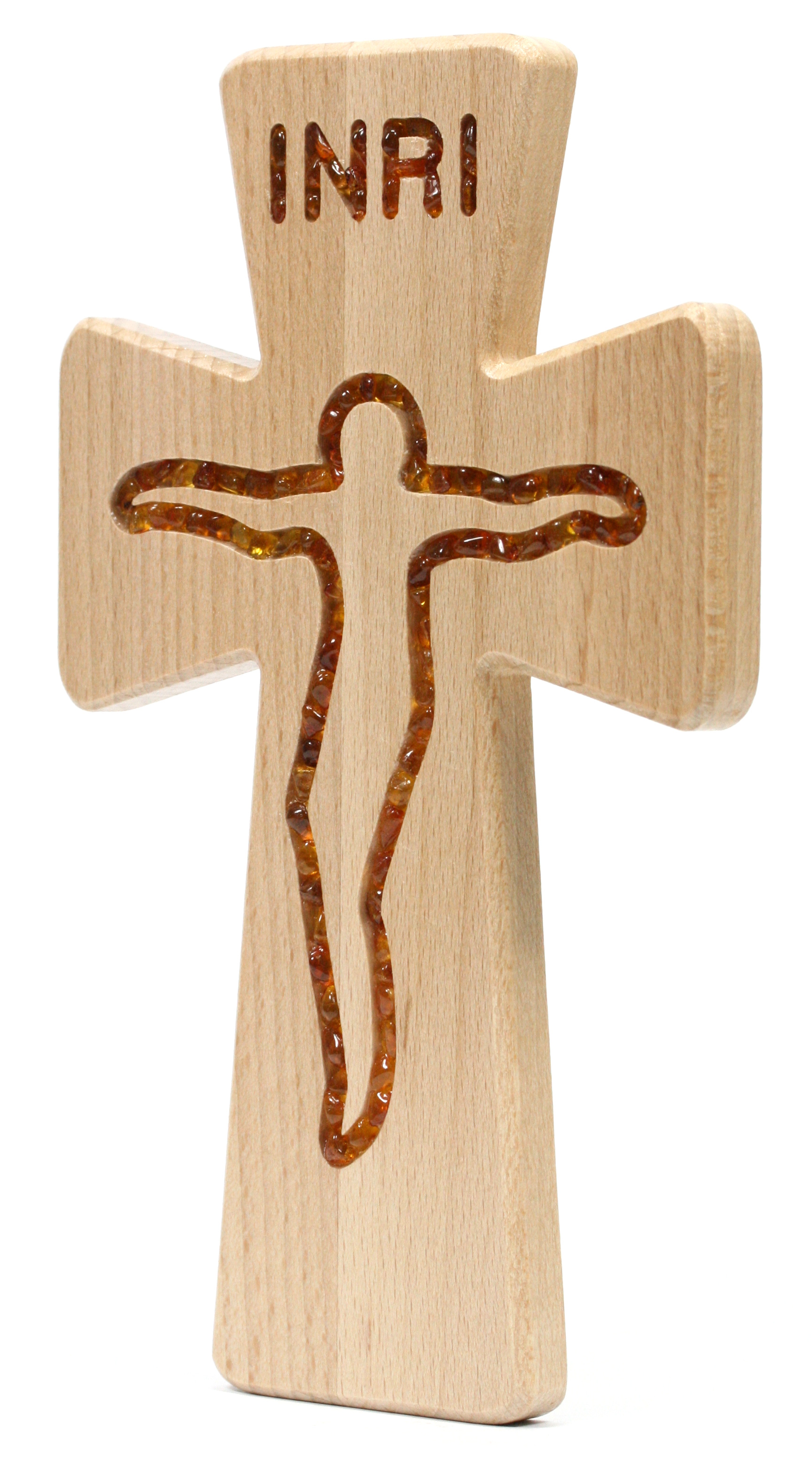 - Holzkreuz mit Inschrift "Inri" und Jesusdarstellung mit Bernstein eingearbeitet
