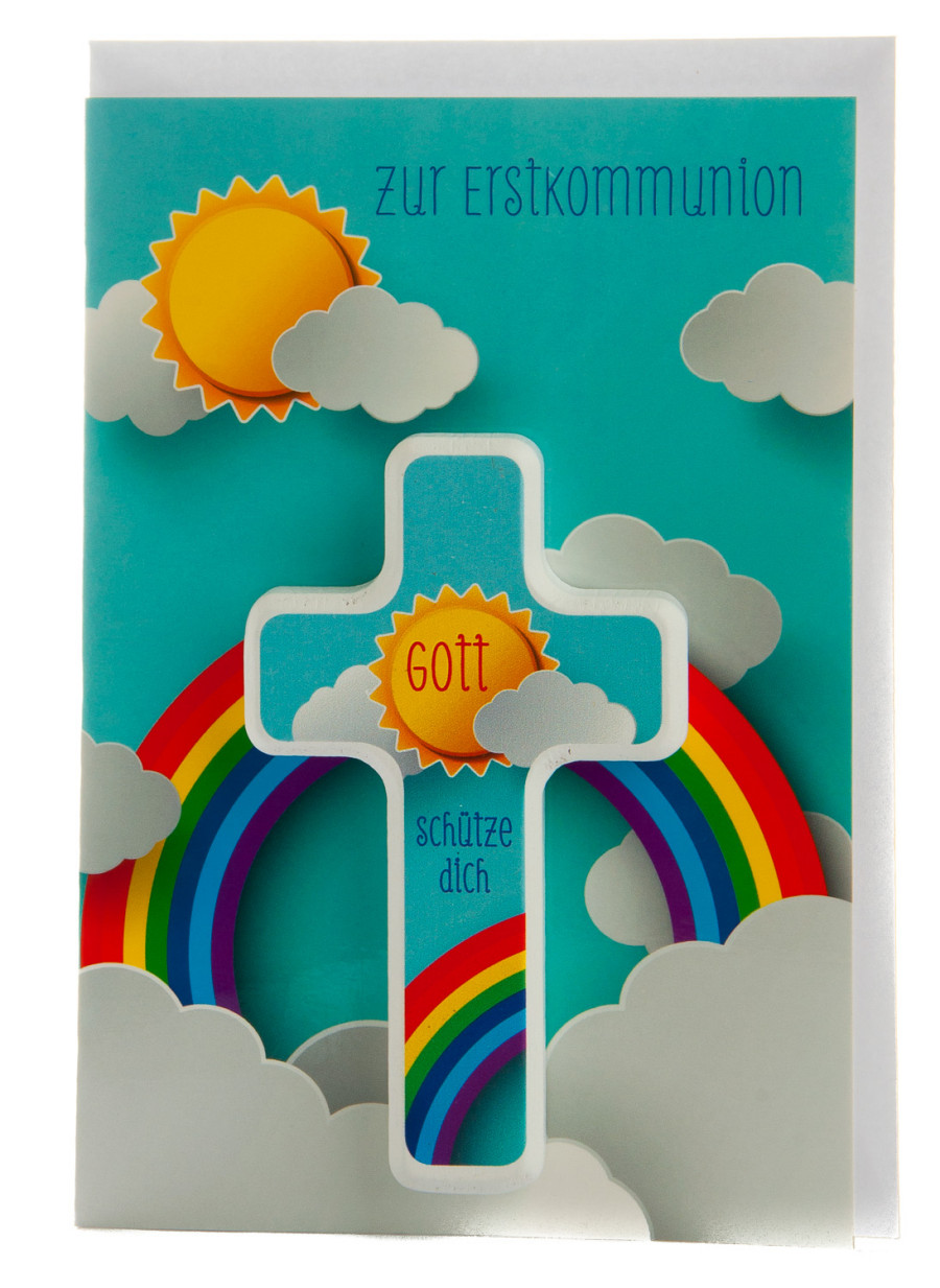 Produktinformationen "Karte zur Erstkommunion - Sonne mit Regenbogen & Holzkreuz"