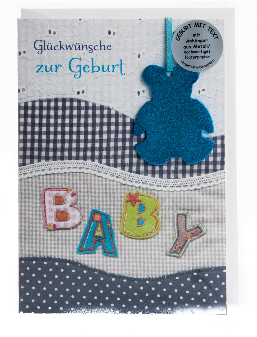 - Glückwunschkarte zur Geburt mit einem Teddyanhänger