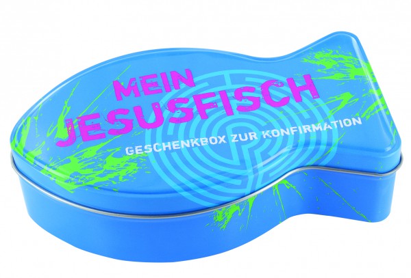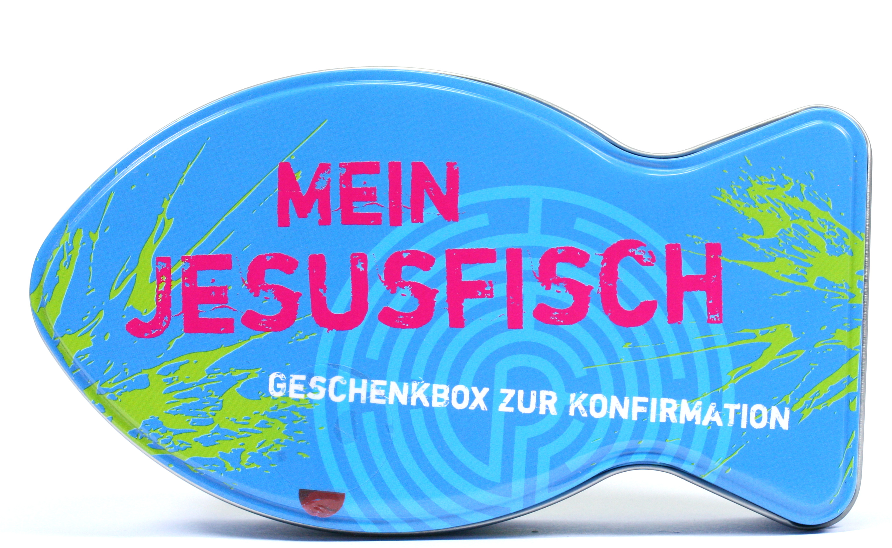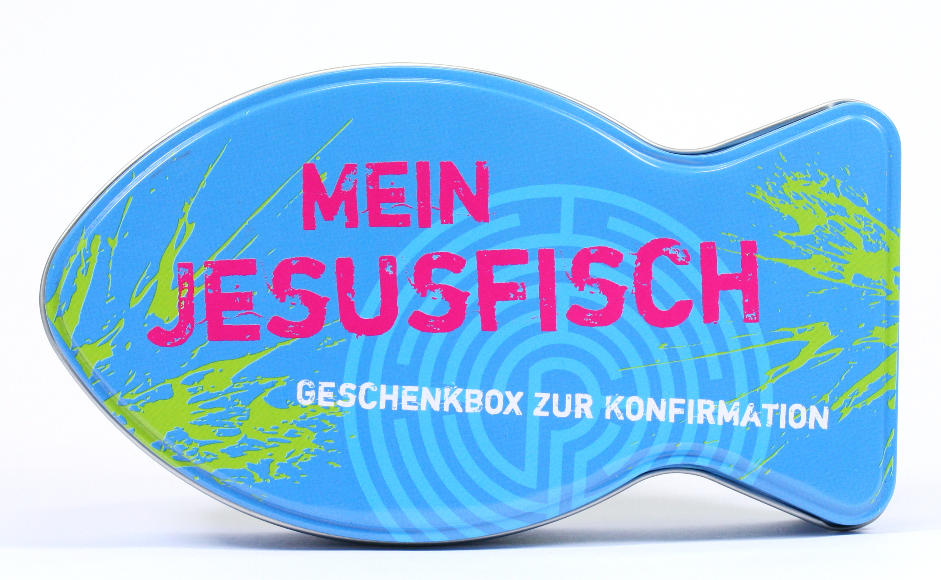 - Text auf der Fischdose: "Mein Jesusfisch Geschenkbox zur Konfirmation"