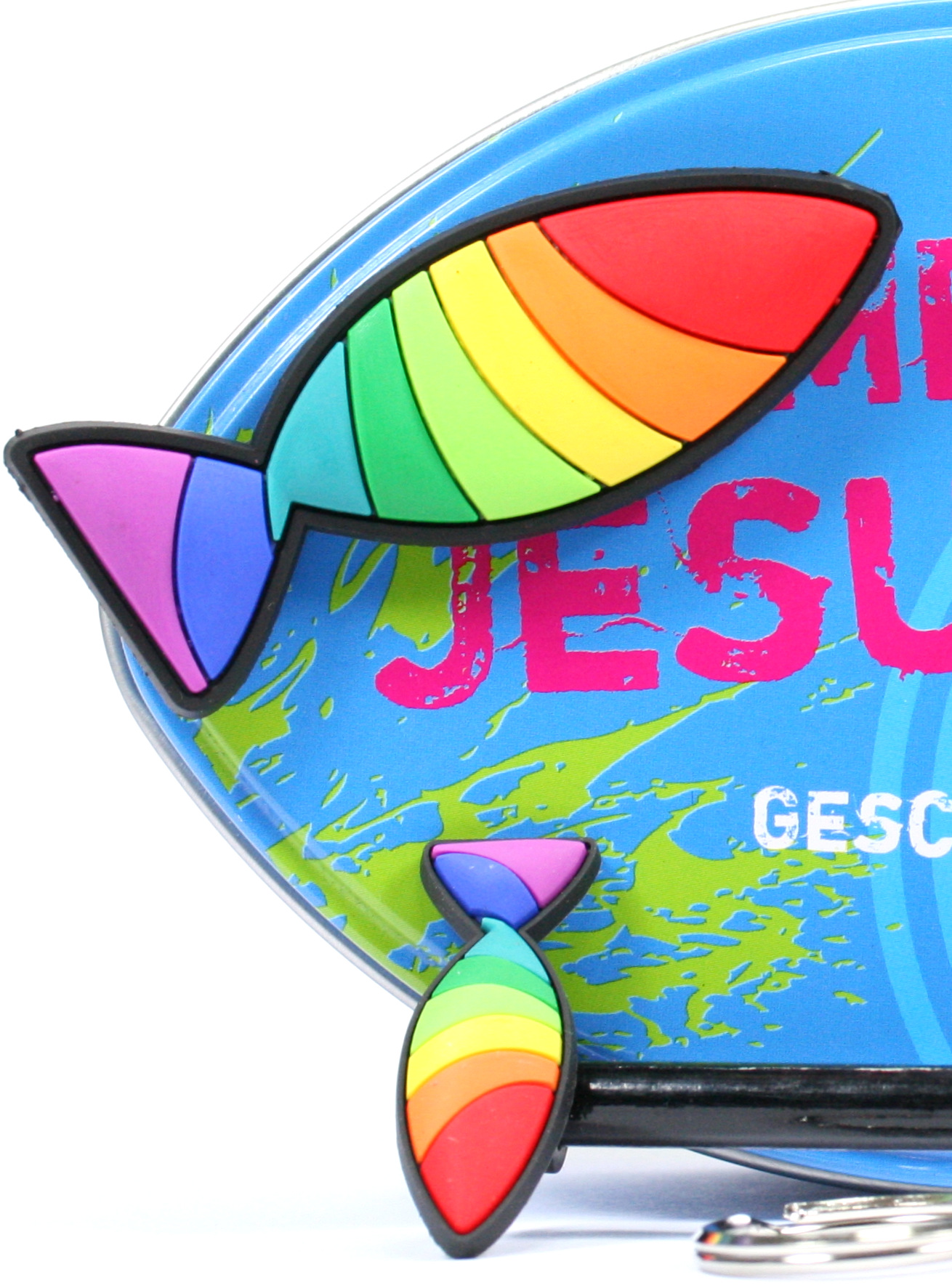 der Fisch ist ein Zeichen, das schon die ersten Christen benutzt haben. In einer Zeit, als sie wegen ihres Glaubens verfolgt wurden, nutzten sie ihn als geheimes Erkennungszeichen. Auf Griechisch heißt Fisch "ICHTYS". Das sind die Anfangsbuchstaben der Wörter "IESOUS CHRISTOS THEOU YIOS SOTER", was bedeutet: Jesus Christus, Gottes Sohn, Erlöser. Auch DU kannst dich mit dem Zeichen des Fisches zu Jesus bekennen."
