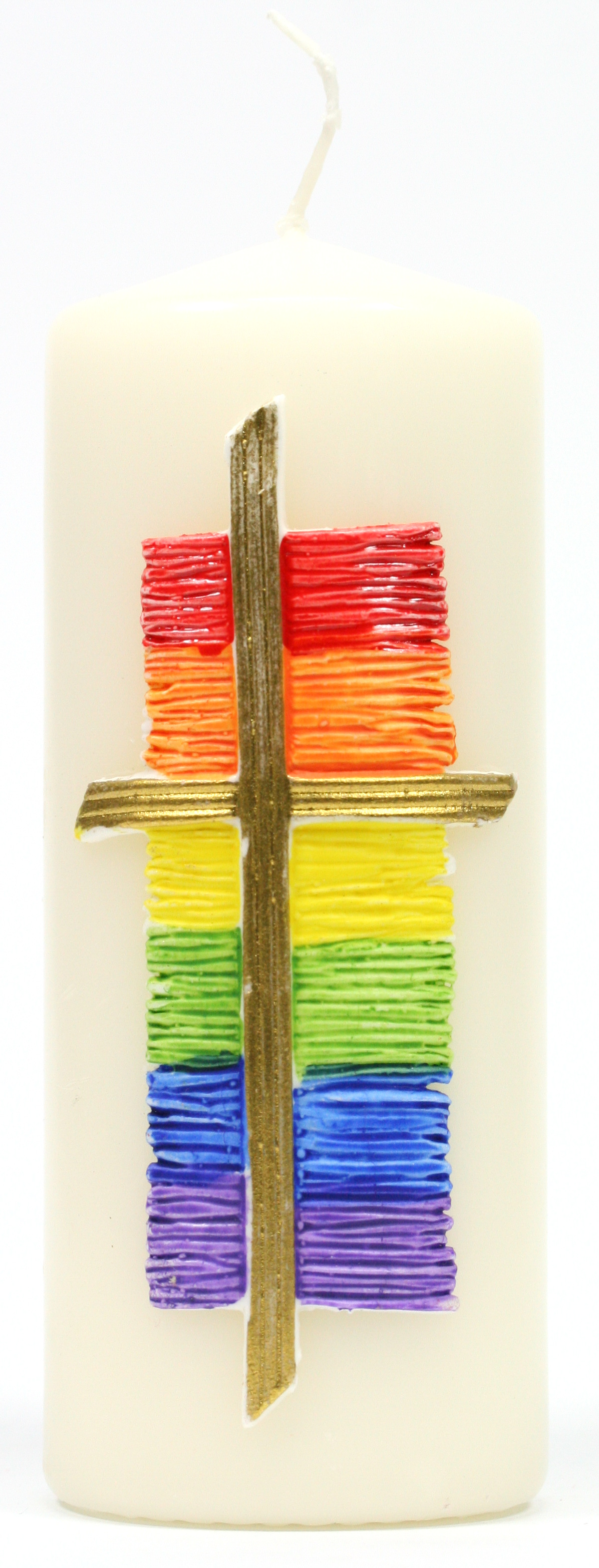 - Tischkerze mit Regenbogenfarben und goldenes Kreuz